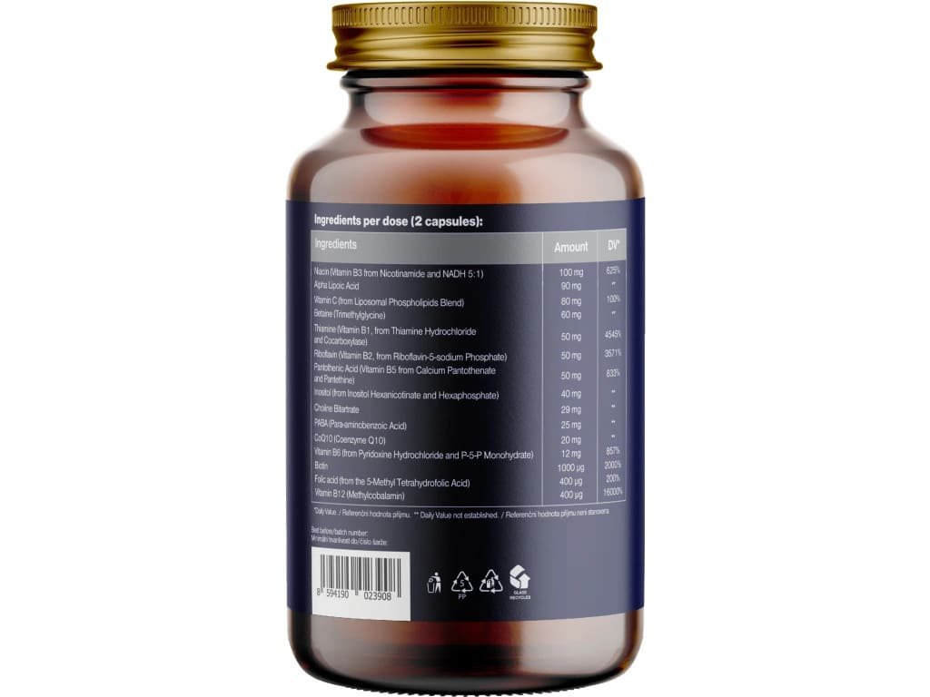 Ez a komplex formula nem csupán a B-vitaminok teljes spektrumát nyújtja, hanem koenzim Q10-zel, liposzómás C-vitaminnal, kolinnal, inozitollal, betainnal és erős antioxidáns alfa-liponsavval is kiegészül. Célja a maximális energiaellátás, az idegrendszer védelme, a mentális és fizikai teljesítőképesség növelése, valamint a fáradtság hatékony csökkentése. Vegán, adalékanyagmentes és Csehországban készült.